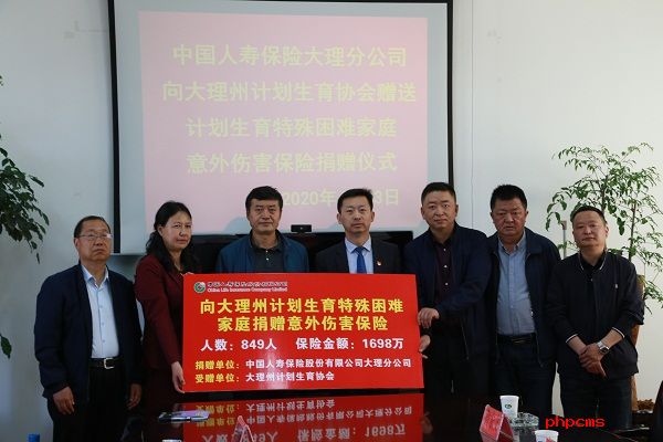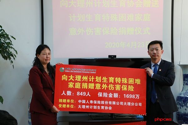 4月23日,中国人寿保险大理分公司向大理州计生协会赠送计划生育特殊困难家庭人身意外伤害保险捐赠仪式在大理州计生协会举行。本次捐赠涉及849人,保险金额1698万元。