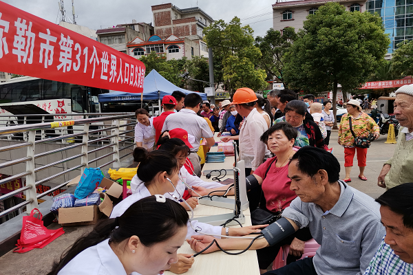 7月9日,弥勒市卫健局、市计生协会联合在佛城广场开展“牢记为民初心,护卫百姓健康”为主题的第31个世界人口日义诊宣传活动。