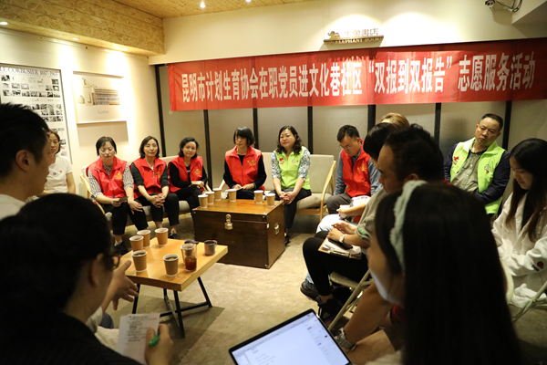 7月17日,昆明市计生协组织全体党员到五华文化巷社区开展“双报到双报告”志愿服务活动。