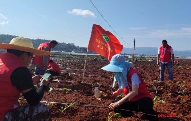 5月8日,弥勒市虹溪镇计生协会组织71名志愿者到招北村委会小西冲村核心烟区参与烤烟移栽活动。