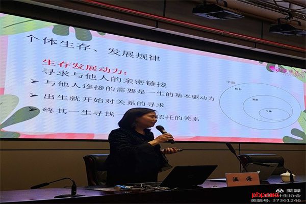 温海教授向大家讲述了人们生存和发展的动力就是寻求与他人的亲密链接,生存和发展的条件就是他人的关注、爱与被爱。温海教授还结合工作中的实际案例向大家分析了不同年龄阶段的孩子会出现的不同心理问题以及解决的办法。