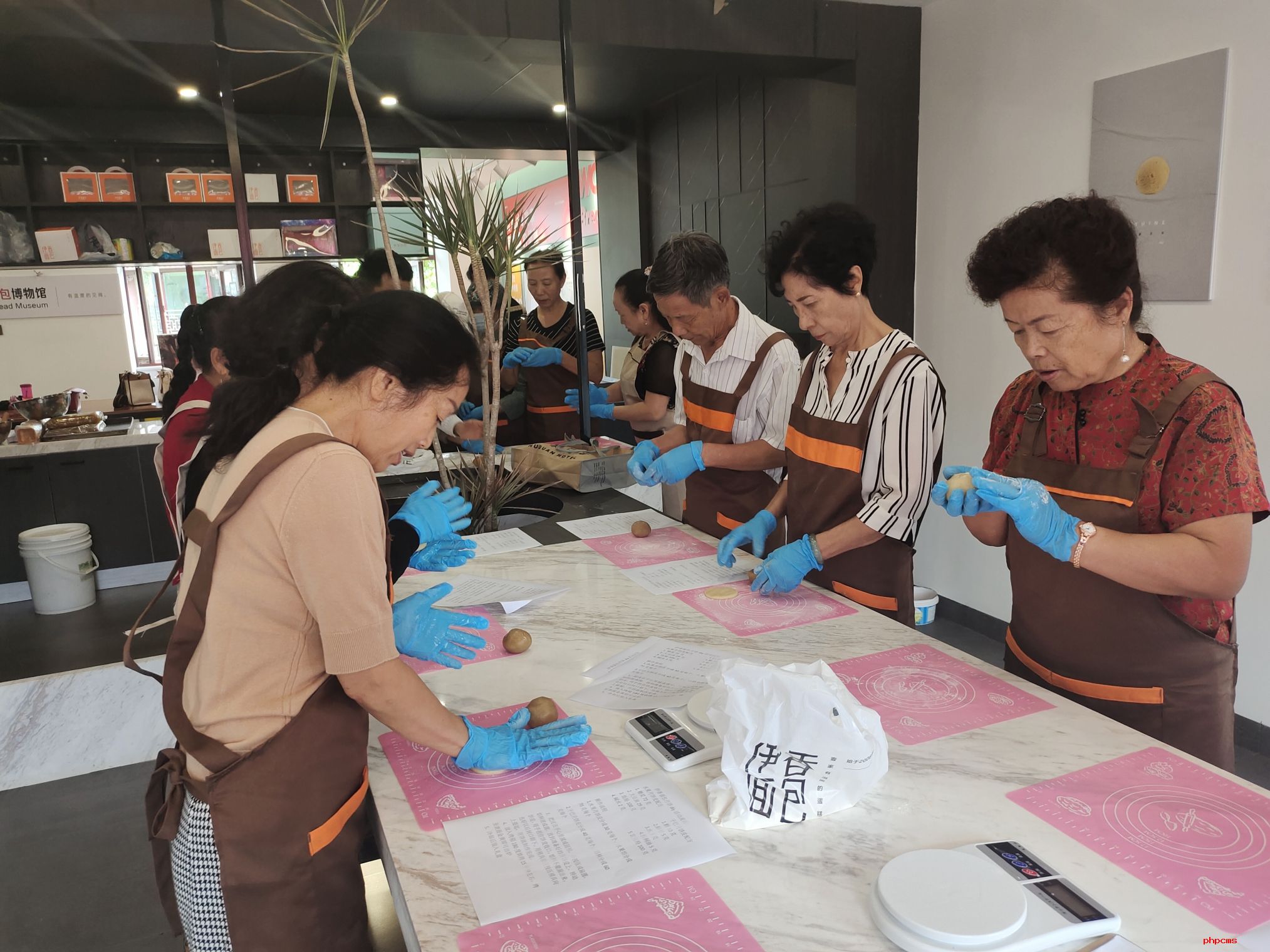 在这特殊的团圆佳节,还邀请到糕点老师示范制作月饼。老师示范着将面皮搓圆、摊平、包馅儿,然后借用食指和拇指的力量缓慢向上收口,合拢后滚上面粉放入模具。大家边学边做,不一会儿功夫,一个个精美的干巴、五仁、凤梨、蛋黄莲蓉月饼便入模成形,喧嚣热闹而又井然有序,欢声笑语撩动着在场每个人的心弦。