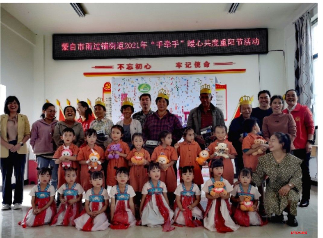 三是大手小手“送”温情。在蒙自雨过铺街道暖心家园(市级项目点),蒙自市计生协开展2021年手牵手暖心共度重阳节活动。活动在新光幼儿园小朋友表演的《抬起头》、《中华孝道》节目拉开序幕,并为计生特殊家庭成员送上帽子、手套等暖心礼物。活动中还进行了健康知识问答、健康生活交流座谈。