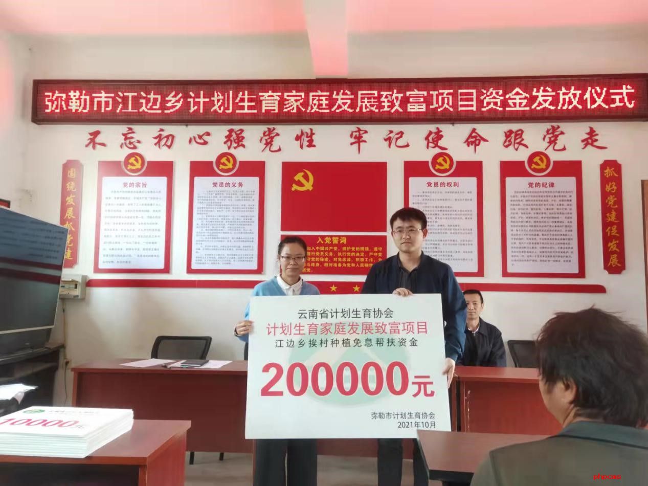 10月13日,红河州弥勒市计生协到江边乡挨村举行计划生育家庭发展致富项目资金发放仪式,为缺资金、缺技术、想致富的贫困计生家庭10户发放种植松茸、香椒、无筋豆等项目免息两年帮扶资金20万元。