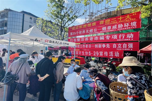 为积极倡导新型婚育文化,促进人口均衡发展,深入推进“两个革命”开展“学做”活动,2022年5月29日,大理州洱源县计生协和县卫生健康局组织县人民医院、县中医医院、县妇计中心、县疾控中心、县健教所、人寿保险洱源分公司、五洲医院等单位,在县城新华书店门口开展“促进家庭健康——喜迎二十大”为主题的“5.29会员活动日”宣传服务活动。