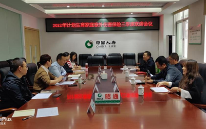 2022 年 9 月 21 日上午,昭通市计划生育协会党组书记、常务副会长蒙志强一行到中国人寿昭通分公司参加“2022年第三季度计划生育家庭意外伤害保险联席会”。昭通市计划生育协会副会长兼秘书长陈明乾、中国人寿昭通分公司总经理董光祥、中国人寿昭通分公司副总经理张萍及相关工作人员参加会议。