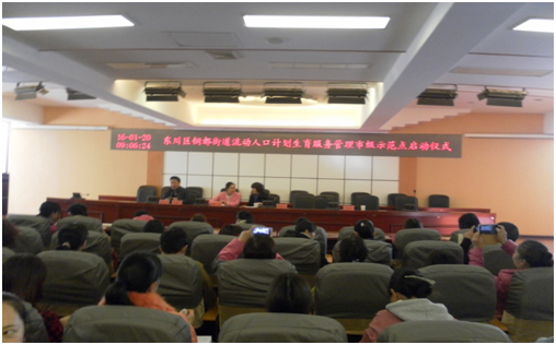 为加强流动人口计划生育服务管理,有效推动流动人口公共服务均等化服务,在昆明市计生协的大力支持下,2016年1月20日上午,东川区铜都街道流动人口计划生育服务管理市级示范点项目工作正式启动。区计生协副会长孙良红,区计生协会秘书长谭忠琼,铜都街道计划生育协会领导、秘书长及各社区分管领导、流管员、协会秘书长参加了启动仪式。仪式上,区协会副会长孙良红作了示范点工作的安排,要求示范点要严格按照项目文本要求,牢固树立服务主体意识,真心关爱、真情服务流动人口,为广大流动人口提供均等化服务,按时保质保量完成各阶段工作,迎接市计生协会的评估验收。