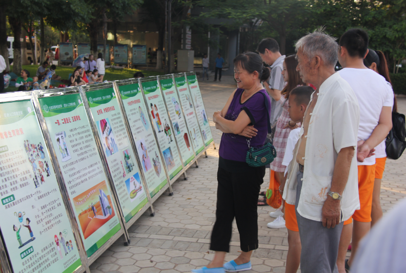 在文艺演出的过程中,现场摆放全面两孩政策知识展板20块,工作人员向观众1000余人发放了环保袋、两孩政策、基本公卫及健康知识折页等宣传资料,并穿插了全面两孩政策知识竞答,现场观众积极参与抢答,整个晚会气氛热烈。