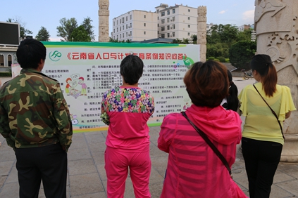 二、加强学习,活动开展前县计生协会牵头,组织工作人员集中学习了《中共中央国务院关于实施全面两孩政策改革完善计划生育服务管理的决定》和《云南省人口与计划生育条例》,以便对前来咨询相关政策的群众进行准确解答;充分宣传,活动选择在人员集中、人流量相对较大的堂琅广场开展,通过悬挂横幅、设立宣传展板、发放宣传资料、宣传用品等方式,对新政策、条例进行广泛宣传。