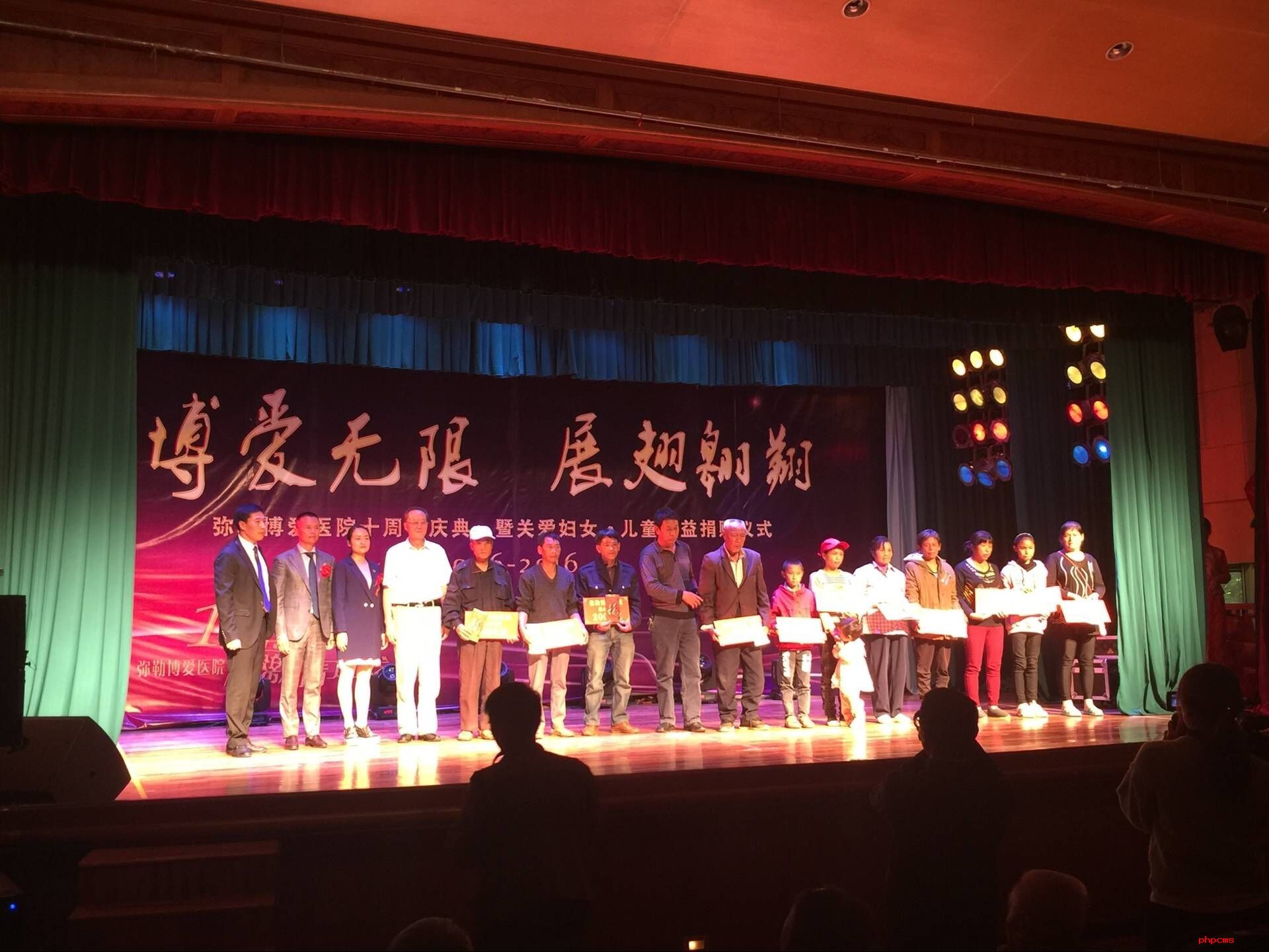 为感谢社会各界人士对弥勒博爱医院的关心和支持,在院庆10周年到来之际,博爱医院决定帮助一些贫困妇女和贫困儿童解决生活困难,市关工委、市计生协会、市妇联通过调查核实,在全市12个乡镇及东风农场管理局筛选出4名贫困妇女儿童和9名贫病妇女作为院庆捐赠对象。捐赠现场,市关工委、市妇联领导分别对捐赠对象作了励志动员讲话,并与博爱医院领导一道为每名捐赠对象发放2000元救助金和1床棉被。