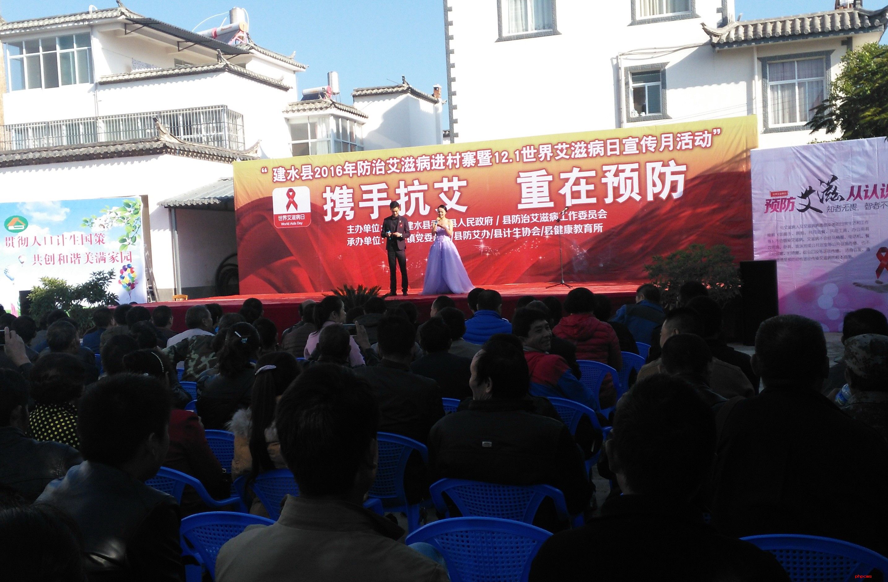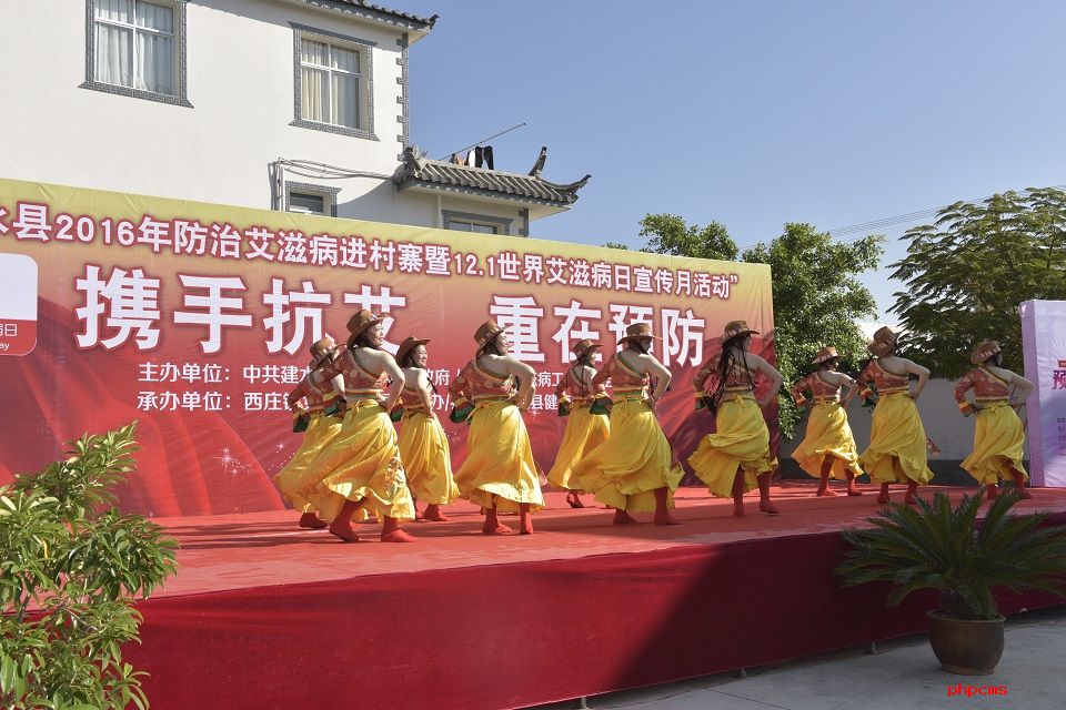 12月5日上午,由红河州建水县委、县人民政府、县防治艾滋病工作委员会主办,西庄镇党委政府、县计生协会等单位承办的“携手抗艾,重在预防”文艺演出活动在西庄镇新房村委会举行。