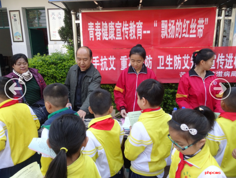 4名佩带红丝带的芒市民族中学学生代表小老师们,面对宣传展板,向前来参观学习的小学生讲授了展板图片知识,并耐心回答低年级学生的各种提问,使小学生对青春期发育和艾滋病发生有了一个正确的认识。活动还以发放宣传品、有奖问答等形式,通过同龄伙伴间尊重、平等,共同参与、互动交流的方式,开展得有声有色。同时,也使关心艾滋病感染者和病人及其家属的含义得到广泛宣传,同学和老师对艾滋病有了更进一步的了解,消除了中小学生对艾滋病的恐惧心理。营造了良好的社会舆论氛围,受到了师生的一致好评。