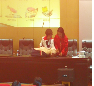如何在抢救的黄金时间给生命垂危的人做心肺复苏,排除气道异物梗阻。很多同学都亲身去体验了心肺复苏、人工呼吸的基本动作,并很快掌握了基本方法。现场气氛非常活跃,身临其境的感觉更好的调动了大家的积极性,引起了同学们的浓厚兴趣,帮助大家在仿真的情景下学到了应急的知识。