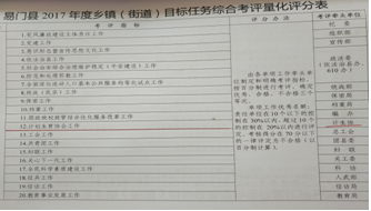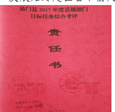 易门县2017年度目标任务综合考评责任书,是为确保2017年县委、县政府各项目标任务落实,实现易门经济社会发展始终走在省市前列、与全市同步如期脱贫的总体目标,按照县委、县政府对目标任务综合考评工作的要求制定并签订的。