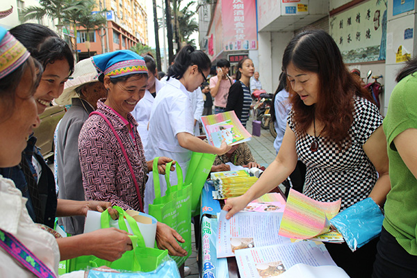 7月10日,怒江州计生协、泸水市计生协在州中医院门口联合开展“7.11”世界人口日宣传活动。