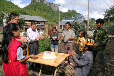 2017年8月8日,在白忠全52岁生日之际,鸣鹫镇计生协会组织志愿者10余人来到他的家中,为他送上生日蛋糕,心中充满喜悦的他特意换上了家中最体面的一件西装出来迎接,志愿者队员帮他带上生日帽,唱生日歌,在生日歌的祝福下,白忠全开心的许下生日心愿,并为大家切分蛋糕,随后大家齐动手帮助其打扫家庭卫生,来自鸣鹫镇计生协会的生日慰问为这个家庭洒入一米阳光,白忠全自己也积极加入打扫家庭卫生的行动中。一个人生活态度的转变,来自他对家中一点一滴的改变,看着家中重新变得干净整洁,仿佛这个家又再次重满了生机。白忠全心中万分激动地说:是计生协会让我重新获得了新生,我一定早日走出失独阴影,重拾对生活的希望。