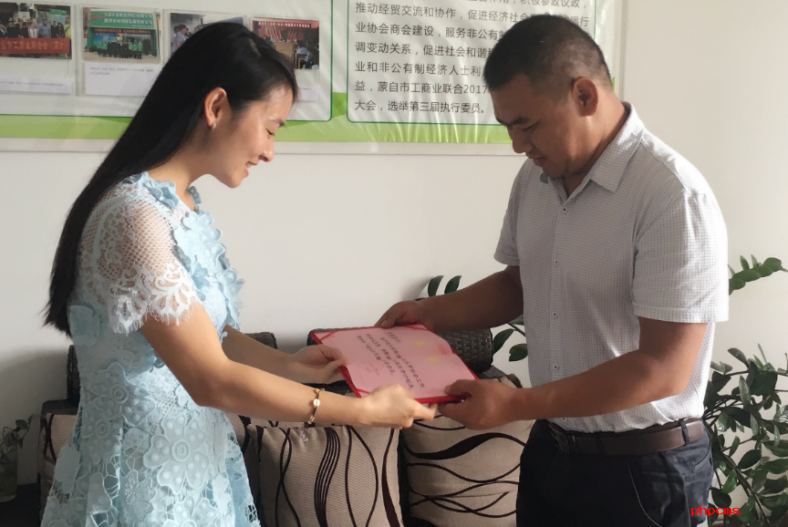 8月29日,蒙自市计生协带着精心设计定制的“爱心会员”聘书,郑重地颁发到市工商联主席李海荣手中,表达了诚挚谢意,感谢李主席一直以来对计生协工作的关心帮扶和大力支持。在留守儿童慰问关怀、失独家庭帮扶建房等爱心活动中,李主席积极协调爱心企业以捐款、捐物等形式开展对口帮扶,极大地解决了市计生协资金短缺的困难和问题。
