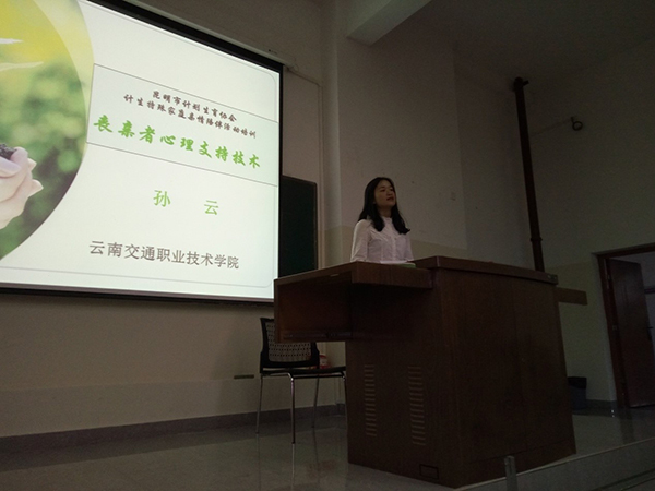 昆明市计生协项目负责人向志愿者介绍了开展计生特殊家庭帮扶项目的背景和意义,去年项目开展基本情况及今年项目的具体内容及相关要求。培训邀请云南交通职业技术学院心理中心主任、道路交通事故心理援助专家孙云教授进行授课。