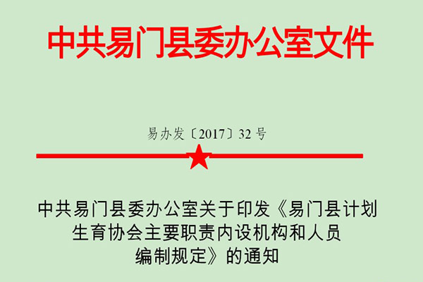 经易门县委机构编制委员会审核、县委批准,《易门县计划生育协会主要职责内设机构和人员编制规定》于9月19日正式印发,易门县计生协“三定”得到落实。规定要求设立易门县计划生育协会,列入群众团体序列,归口县委管理,不定机构规格。