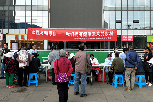 11月11日,在“糖尿病日”到来之际,弥勒市卫计局、计生协会组织市疾控中心、市健康教育所、弥勒第一医院以及弥阳、城东两个社区卫生服务中心在佛城门口开展“女性与糖尿病——我们拥有健康未来的权利”主题宣传义诊活动。