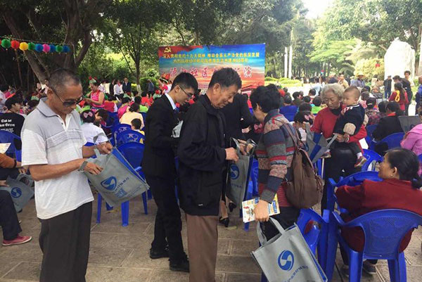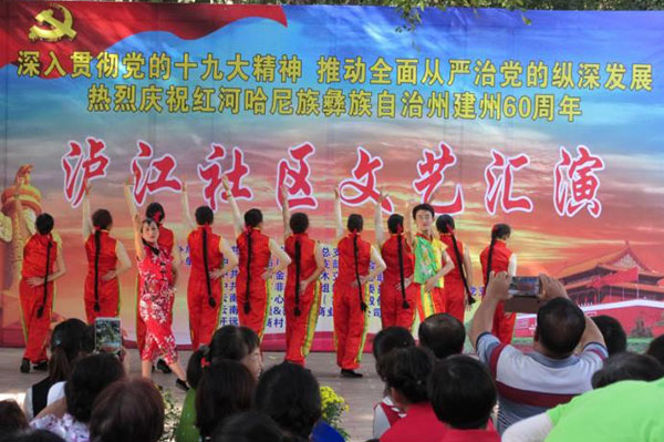 11月10日,开远市灵泉办街道办事处泸江社区计生协会,携同辖区内川渝商会、开远金板凳苗木交易中心、绿源电动车行、云南鸿翔一心堂药业(集团)股份有限公司、云南大昌隆&喜玛特商业有限公司、开远沪农商村镇银行,在开远市泸江公园举办以"学习宣传贯彻党的十九大精神,热烈庆祝红河哈尼族彝族自治州建州60周年"为主题的文艺汇演。