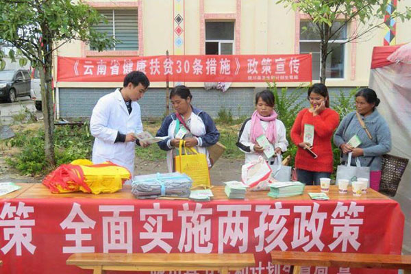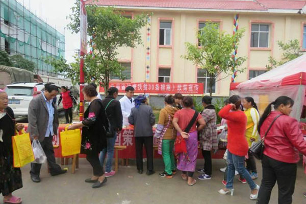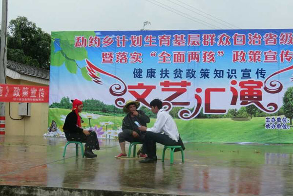 演出中还时不时穿插着全面两孩政策、《云南省健康扶贫30条措施》、防治艾滋病知识有奖问答,群众踊跃抢答,把整场演出活动推向新的高潮。特别是“国家全面两孩政策好!”小品的演出,善于结合政策“新”的内容精心设计编排,采用群众简洁易懂、幽默风趣的语言,集中反应了两孩政策贴近人心,育龄群众自觉自愿实行计划生育政策,营造了科学文明进步的婚育观念。为帮助建档立卡户进一步理解《云南省健康扶贫30条措施》主要内容,利用当天勐约乡街天之机采取悬挂布标、向建档立卡户发放宣传折页,医务人员面对面的详细讲解健康扶贫30条措施、开展议诊活动等方式帮助群众强化理解、掌握运用政策,确保健康扶贫政策深入人心,在短时间内速迅普及。
