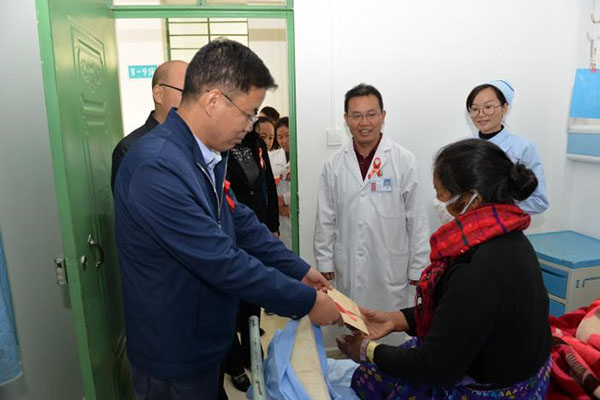 11月30日上午,在第30个世界艾滋病日即将到来之际,德宏州委州委、州人民政府副州长闫卫国、州政府副秘书长尚正宠在州防艾局领导及芒市防艾局相关人员陪同下到芒市人民医院感染科,与艾滋病治疗的一线医务人员进行亲切交谈,了解艾滋病抗病毒治疗工作情况,并看望和慰问正在接受抗病毒治疗的抗病毒治疗患者及两名艾滋病致孤儿童。