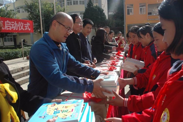 启动仪式上,为者岱小学授予了“关爱留守儿童阅读行动示范点”牌匾,并为把者岱小学捐赠价值1.25万元,共计571册新图书。