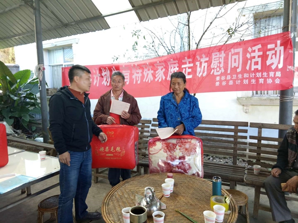 1月17日,景谷县计划生育协会深入到碧安和勐班两个乡镇开展“计划生育特殊家庭走访慰问活动”,为计划生育特殊家庭困难户送去慰问金及物资。