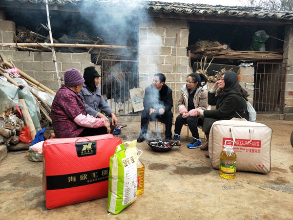 矣果村委会独家村李琼英老俩口已年逾八旬,32年前他们失去了儿子,在无儿无女的情况下,老俩口还购买了一辆电动三轮车,挣钱过日子。83岁的李琼英激动地说,感谢党和政府关心我们老俩口,还为我们送来过冬棉被、毛毯、大米和香油,有你们的关心,今年春节会过得更好。