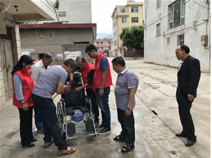 6月12日,红塔区李棋街道下赫社区计生协、部分志愿者及街道人大主任杨进松等领导,到下赫六组走访慰问计划生育特殊家庭陈树林老人,为老人送上需要的多功能轮椅,并教老人怎样使用。老人的一句话“上次你们来看我,我才跟你们反映,今天你们就送来了,你们都是为人民群众办实事的好领导,谢谢你们!”充分体现了党和政府对计划生育特殊家庭的殷切关怀。