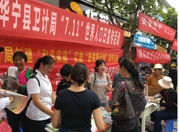 7月11日,华宁县卫计局、计生协会等10余家单位在县城中心城区东市街联合开展宣传服务活动,卫生和计生局组织卫生计生系统卫生监督局、疾控中心、妇幼保健计划生育服务中心、宁州卫生院、人民医院中医医院和局机关室共15人开展法制、世界人口日宣传活动,活动现场通过悬挂横幅标语、发放宣传资料、设置宣传咨询服务台,向赶街的群众大力宣传计划生育的成就,及相关惠民政策和卫生健康知识。共发放《食品安全法》《义务献血法》《公共场所卫生管理条例》《云南省人口与计划生育条例》《云南省流动人口计划生育工作规定》《健康知识宣传手册》等卫生计生法律法规和健康知识、两癌筛查、产前筛查、肝炎预防、高血压注意事项、防治糖尿病、龋齿的预防、更年期保健、艾滋病梅毒的防治、谨防野生菌中毒等科普知识宣传资料共20类、5500余份,发放安全套200盒,宣传袋1000个,为群众免费测量血压300余人。