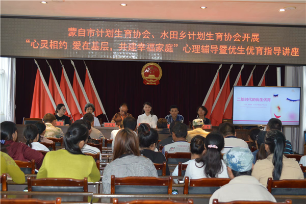 9月20日,蒙自市计生协率心理辅导和优生优育指导专家团队,走进脱贫攻坚乡山区乡镇—水田乡人民政府,正式启动全市“心灵相约,爱在基层,共建幸福家庭”心理辅导暨优生优育指导讲座。