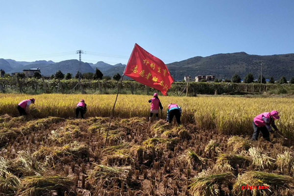 10月18日下午,弥勒市新哨镇小路体村刘永武家稻田里红旗飘扬,热闹非凡,12名男女群众有的在割稻谷,有的在脱谷粒,这是路体社区计生协会组织会员正在帮助计生贫困缺劳力户家庭收割稻谷。