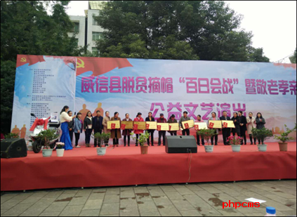 2018年10月21日,威信县在县城扎西体育广场举办脱贫摘帽“百日会战”暨敬老孝亲公益文艺演出。演出活动由威信县委宣传部,老龄委、计生协会等十三家单位主办、扎西社工党支部、服务中心、深狮博雅服务队承办,特殊学校、麒麟幼儿园、牧云堂文化推广工作室等十四家单位和爱心企业协办,县政府副县长、老龄委主任王春云到会指导 并发表重要讲话。