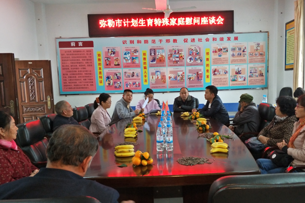10月30日,弥勒市卫计局、市计生协会联合弥阳镇在城东社区召开计生困难家庭代表座谈慰问会。城东、城西、城关、丫普龙、当甸五个社区16户计生困难家庭和6名村(社区)计生宣传员(协会秘书长)参加。