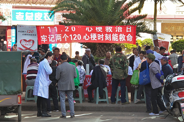 11月20日是第五个“全国心梗救治日”。弥勒市卫计局、市计生协会联合弥勒第一医院胸痛中心专家团队一行10人,于11月17日在佛城市场北大门对面小广场开“11·20”心梗救治日义诊宣传活动。