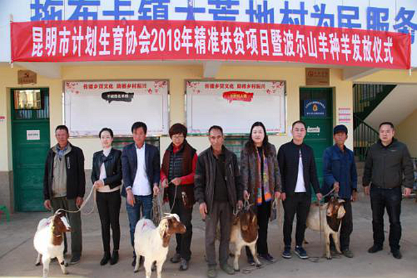 12月5日,昆明市计生协到扶贫挂钩点东川区大荒地村,开展“村村行,扶贫走亲”活动,为结对贫困户发放波尔山羊种羊。