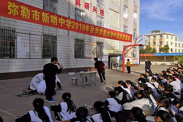 12月6日,弥勒市新哨中心卫生院组织8名计生协志愿者到新哨中学开展2018年秋季学期食物中毒应急救援演练,全校758名师生观摩演练。