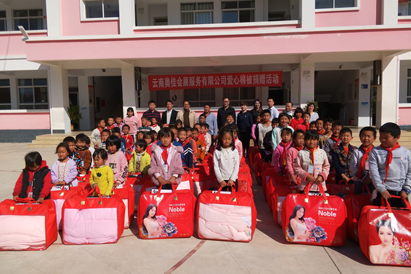 12月27日,云南奥佳会展有限公司到弥勒市江边乡团坡小学,为80名师生捐赠爱心棉被、被套和水杯。