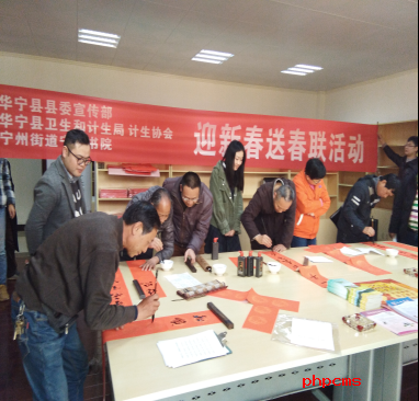 1月18日至23日,深入华宁玉珠水泥责任公司、宁州街道、盘溪镇、青龙镇、华溪镇、通红甸乡开展文化、科技、卫生三下乡”活动 。宁阳书院书法协会会员每到一个活动点即席挥毫,在喜庆的红纸上书写一副副满载祝福的春联,把浓浓的年味和新春的祝福送给群众,群众拿着写满祝福的春联喜悦之情溢于言表。在开展书写赠送春联的同时,乡镇文化、科技、卫生部门向赶集的群众散发卫生健康生育知识、文化服务、科技指导、法律咨询等各类惠民服务宣传资料并现场文艺宣传演出。