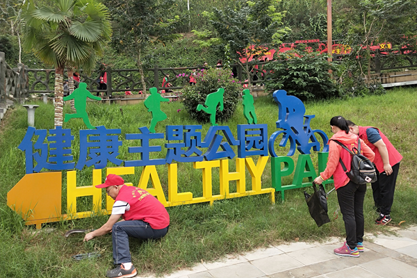 一是结合创卫工作,开展清洁健康主题公园。组织职工统一着装创卫红马褂在森林公园(健康主题公园)开展创卫宣传、清理垃圾、健康步道设施卫生清扫保洁活动。