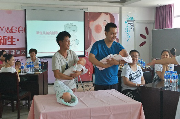 小儿推拿师许蕊将如何护理婴儿日常洗护知识以游戏互动的方式让在座的每一位准妈妈参与其中。准爸准妈们积极参与,利用仿真婴儿认真学习抱宝宝的方法如:手托法、腕托法,竖抱拍奶嗝。