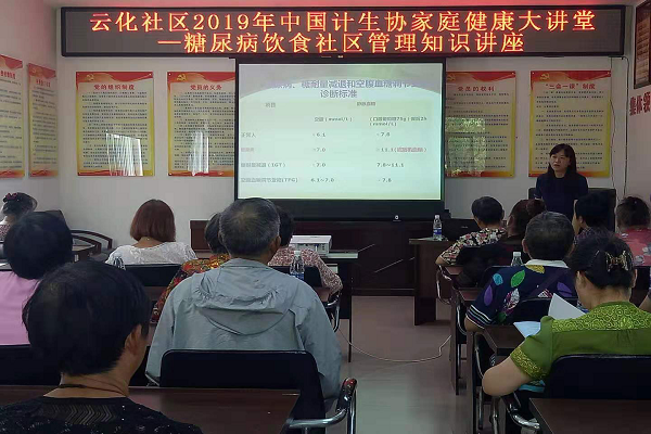 8月21日,昆明市计生协邀请昆医附二院医院健康专家,在安宁市太平街道万辉社区和连然街道云化社区,开展家庭健康大讲堂讲座,社区群众200余人参加。讲座主要围绕糖尿病饮食管理和科学减重方法两个方面的内容,向居民讲解糖尿病的形成原理、危害性以及如何从运动和饮食上预防糖尿病,什么是肥胖病及其危害,肥胖病的影响因素等知识,并给予居民从自身身体状况和药物管理方面入手,尽量做到主食定量、粗细搭配,多吃蔬菜,适量食用水果,蛋类、畜肉和奶类豆类,足量饮水,适度运动等养生和保健建议。参加讲座的群众听得津津有味,有的不时点头认可,有的一边听讲一边记录。