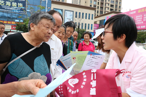 活动现场,来自市疾控中心、市妇幼保健计生服务中心、市健康教育所、弥阳卫生院、弥阳镇计生协会和弥阳、城东两个社区卫生服务中心工作人员通过摆放宣传版面、悬挂宣传横幅、发放宣传手册、宣传单,免费测量血压、健康咨询和义诊等方式,向赶集居民宣传“合理膳食、适量运动、戒烟限酒、心理平衡”的健康生活方式以及高血压、糖尿病等常见慢性病科普知识,受到赶集居民的欢迎。