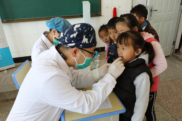 举行简短的启动仪式后,在学校老师的积极协助下,学生们依次进行口腔检查和窝沟封闭治疗。为了缓解学生的紧张情绪,医生们有的小声安慰,有的借着照射口腔光敏灯发出的蓝光,轻声哼着“蓝色小太阳,给你牙齿安上防护墙......”,整个窝沟封闭治疗活动在井然有序、轻松愉悦的氛围中圆满结束。