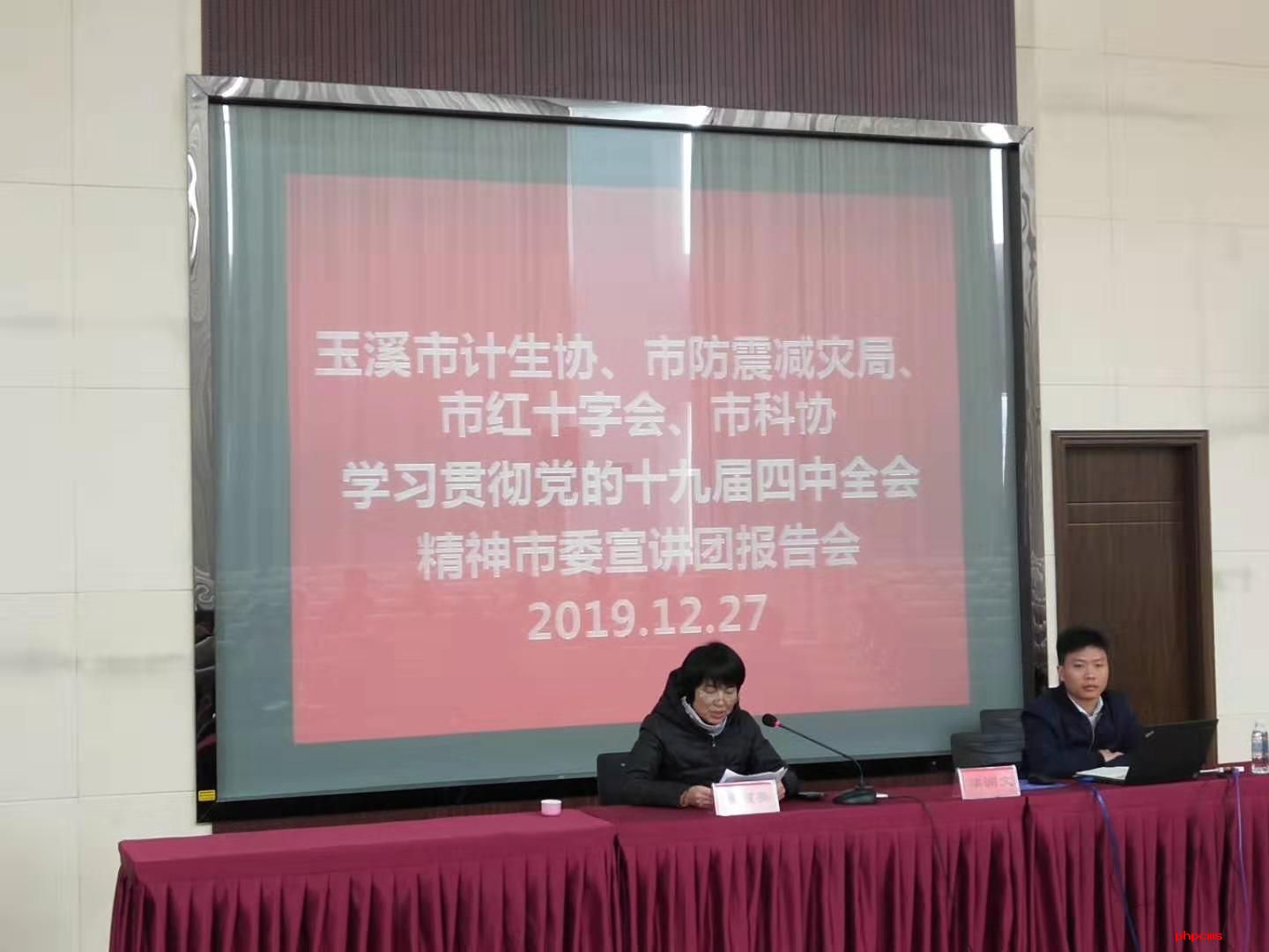 为深入学习贯彻党的十九届四中全会精神,根据中国计生协、省计生协、市委部署及《玉溪市学习贯彻党的十九届四中全会精神宣讲工作方案》要求,12月27日下午,玉溪市计划生育协会联合市防震减灾局、市红十字会、市科协在市防震减灾局科普馆报告厅举行学习贯彻党的十九届四中全会精神市委宣讲团报告会。