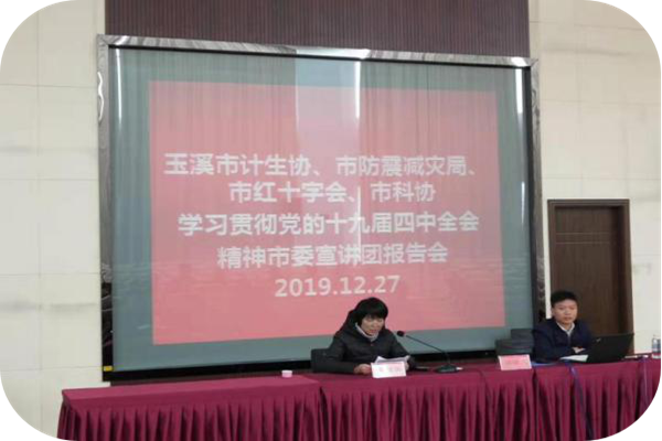 12月27日,玉溪市计生协联合市防震减灾局、市红十字会、市科协在市防震减灾局科普馆报告厅举行学习贯彻党的十九届四中全会精神市委宣讲团报告会。