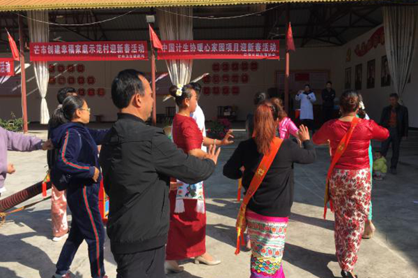 1月17日,芒市幸福家庭示范村-芒晃村的活动室内,芒市幸福家庭示范村芒晃村党支部、芒市卫生健康局老干支部携手芒市勐焕街道、芒市镇计生特殊家庭开展迎新春游园活动。