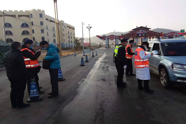 上图:县乡村计生协人员参与设卡疫情防控监测登记。